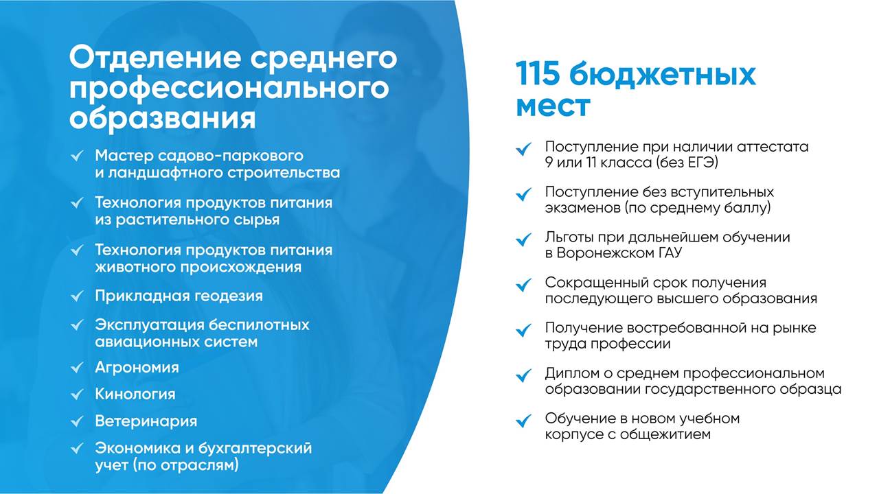 Примечание: ФГБОУ ВО Воронежский ГАУ осуществляет прием абитуриентов для получения среднего профессионального образования по 9-и востребованным профессиям и специальностям “Мастер садово-паркового и ландшафтного строительства”, “Технология продуктов питания из растительного сырья”, “Технология продуктов питания животного происхождения”, “Прикладная геодезия”, “Эксплуатация беспилотных авиационных систем”, “Агрономия”, “Кинология”, “Ветеринария”, “Экономика и бухгалтерский учет (по отраслям)” на основании аттестата о получении основного общего образования (9 классов) или среднего (полного) общего образования (11 классов) без ОГЭ и ЕГЭ.